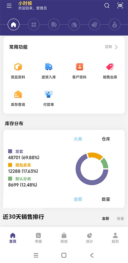 管家通進(jìn)銷(xiāo)存軟件擁有庫(kù)位、色號(hào)等功能特性,適合汽配、陶瓷、五金等商貿(mào)企業(yè)的出入庫(kù)管理,滿(mǎn)足這些行業(yè)的指定需求。支持手機(jī)、電腦、PDA不同設(shè)備的使用,適應(yīng)不同的使用場(chǎng)景。手機(jī)端功能強(qiáng)大靈活,可以輕松實(shí)現(xiàn)條碼掃描出入庫(kù),倉(cāng)庫(kù)內(nèi)盤(pán)點(diǎn)。還可隨時(shí)開(kāi)展在外的業(yè)務(wù),進(jìn)行開(kāi)單銷(xiāo)售。可以根據(jù)不同的用戶(hù)對(duì)象,分別設(shè)置使用權(quán)限。手機(jī)端還可以直接查看每日的經(jīng)營(yíng)概況,如銷(xiāo)售單數(shù)、銷(xiāo)售金額、銷(xiāo)售利潤(rùn)等,提供數(shù)據(jù)性支持,輔助管理員更好的決策公司業(yè)務(wù)發(fā)展方向。