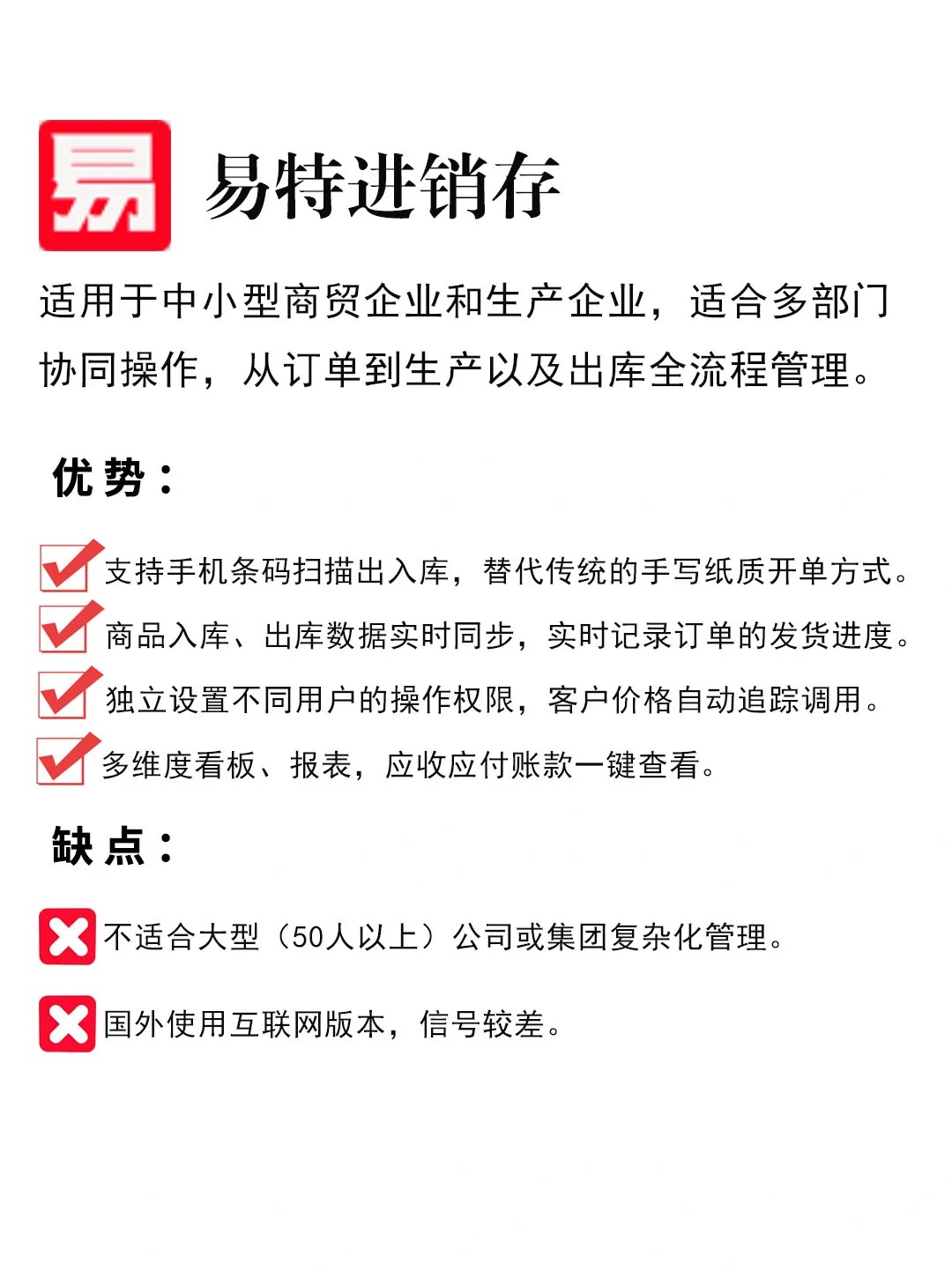 我自己目前現在用的是易特進銷存軟件,這款軟件的性價比高,支持手機端使用,哪怕外出辦公,或臨時有事,都可以隨時拿出手機及時處理查看。還擁有客戶自助下單的小程序,可以讓客戶自己下單,減少業務的辦公壓力。